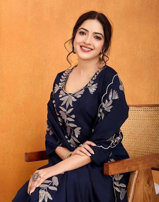 Add elegance to your ethnic wardrobe with this beautifully crafted 3-piece embroidered kurta set for women. Made from premium Vichitra silk fabric, this set features an aqua blue A-line kurta adorned with delicate floral embroidery, paired with matching pants and a coordinated dupatta for a complete festive look.